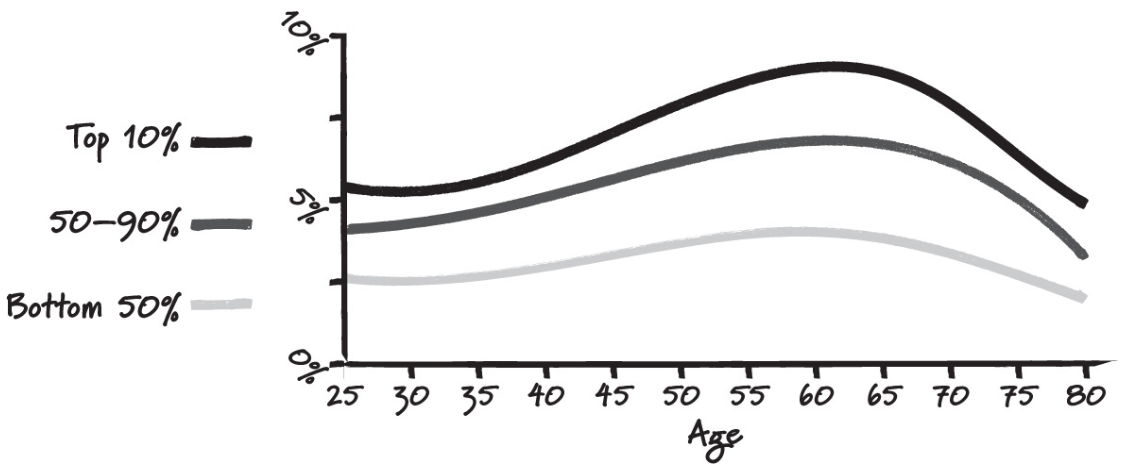Most people keep accumulating wealth for decades, and most don't start spending it down until very late in life.