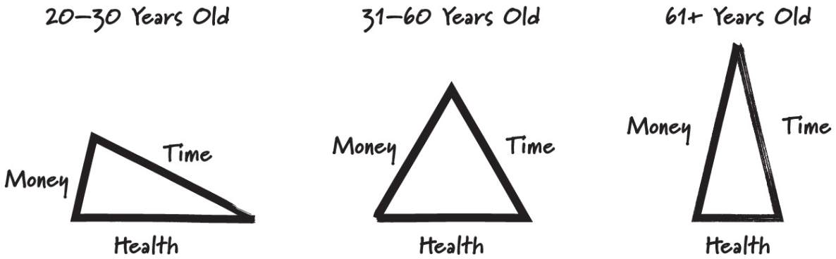 Each age tends to have a different balance of health, money, and free time. Because fulfillment requires reasonable amounts of all three, itβs a good idea at every age to trade an abundance of one (such as money) to attain more of the other two (such as buying more health or free time).
