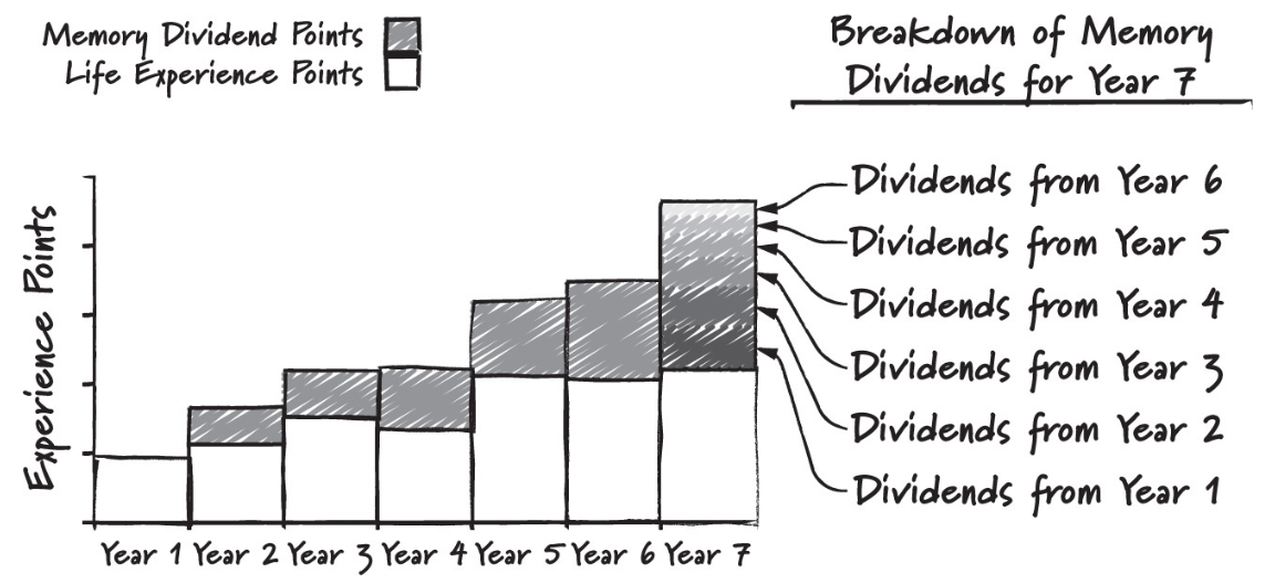Experiences keep on giving in the form of fulfillment from your memories: Over time, the ongoing memory dividend can sometimes add up to more experience points than the original experience provided.