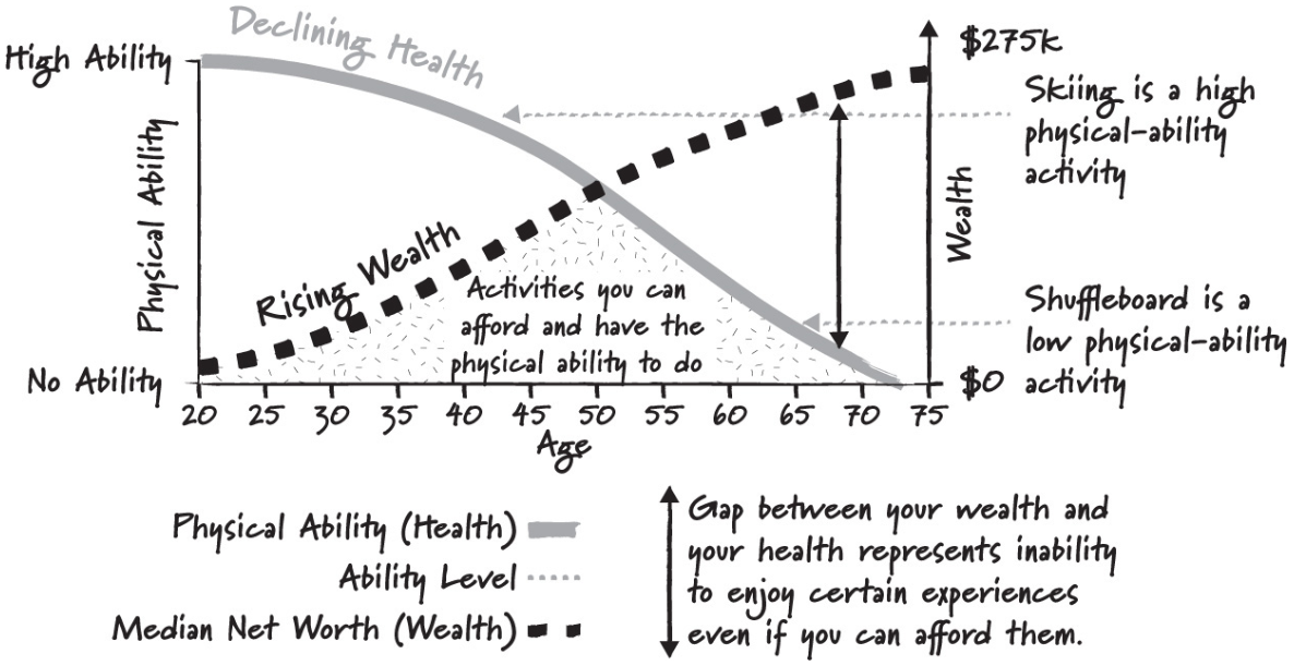 Everyone's health declines with age. Wealth, on the other hand, tends to grow over the years as people save up more and more. But worsening health gradually constrains your enjoyment of that wealth as more and more physical activities become impossible to enjoy, no matter how much money you can afford to spend on them.